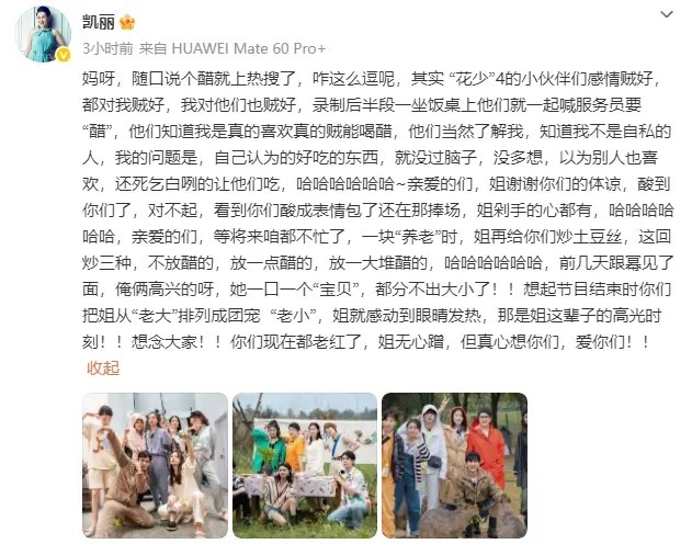 1日,张凯丽在社交平台上发文回应之前在《花儿与少年》节目中炒土豆丝放醋过量事件,她表示:“其实‘花少’4的小伙伴们感情贼好,他们知道我是真的贼能喝醋,我的问题是,自己认为的好吃的东西,就没过脑子,没多想,以为别人也喜欢,还死乞白咧的让他们吃。亲爱的们,姐谢谢你们的体谅,酸到你们了,对不起,看到你们酸成表情包了还在那捧场,姐剁手的心都有。”